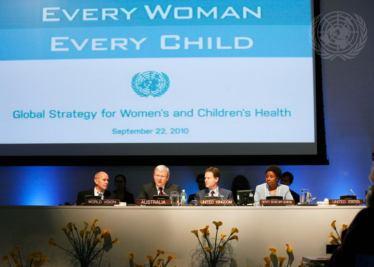 Kevin Rudd (second from left), Minister for Foreign Affairs of Australia, addresses the launch of the Global Strategy for Women’s and Children’s Health, “Every Woman, Every Child”. Pictured with him (from left): Kevin Jenkins, Chief Executive Officer of World Vision; Nick Clegg, Deputy Prime Minister of the United Kingdom; and Deputy Secretary-General Asha-Rose Migiro.