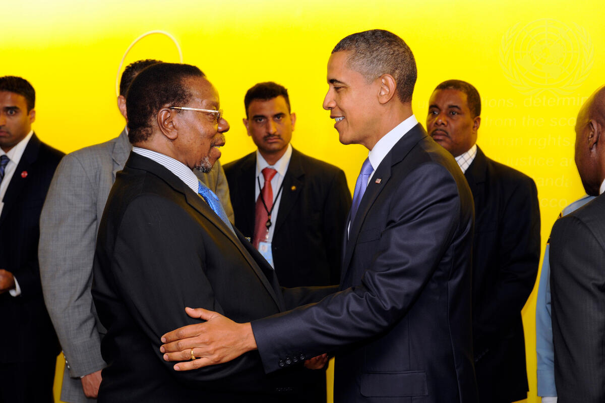 Barack Obama (cente right), President of the United States of America, meets with Bingu Wa Mutharika, President of the Republic of Malawi.