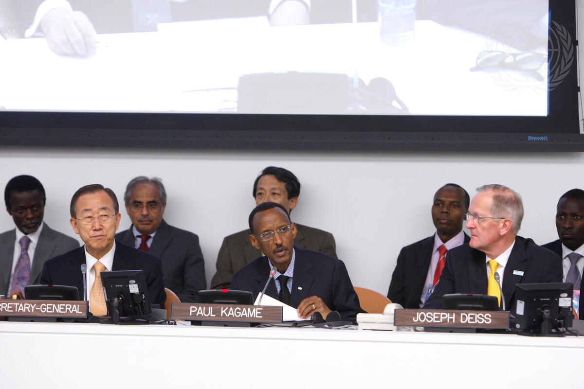 Paul Kagame, President of Rwanda and Co-chair of the Millennium Development Goals (MDGs) Advocacy Group, convenes the opening session of the Group’s meeting. He is flanked by Secretary-General Ban Ki-moon (left) and Joseph Deiss, President of the sixty-fifth session of the General Assembly.