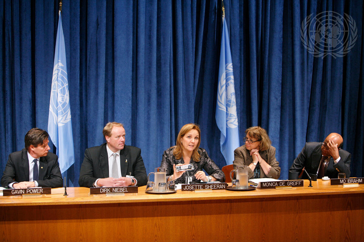 Josette Sheeran (centre), Executive Director of the UN World Food Programme (WFP), addresses a press conference convened by the Global Compact Office on the role of governments and businesses in achieving the Millennium Development Goals (MDGs). Pictured with her are, from left: Gavin Power, Deputy Director of the Global Compact Office; Dirk Niebel, Federal Minister for Economic Cooperation and Development of Germany; Monica de Greiff, President of the Grupo de Energia de Bogota; and Mo Ibrahim, Founder and Chairman of the Mo Ibrahim Foundation.