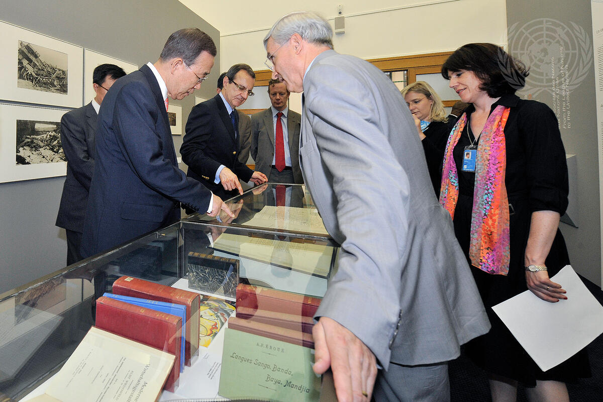 Secretary-General Ban Ki-moon (left) studies books and historical documents exhibited at the League of Nations Museum, inside the United Nations Office at Geneva (UNOG), Switzerland. He is guided by UNOG's Chief Librarian, Pierre Le Loarer (across from Mr. Ban); UNOG Director-General Sergei Ordzhonikidze (second from left); and Blandine Blukacz-Louisfert (right), Chief of the Information Processing Section at UNOG.