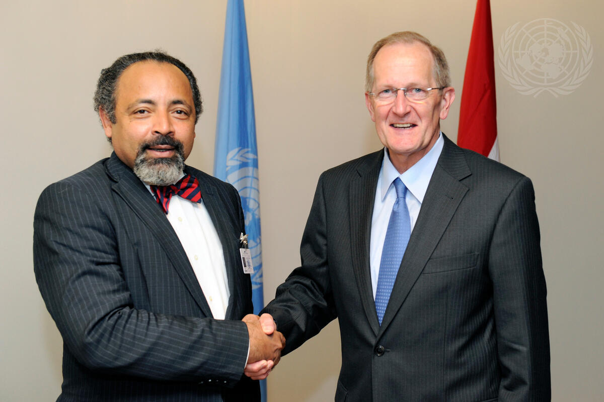 Joseph Deiss (right), President of the sixty-fifth session of the General Assembly, meets with Fahmi Said Ibrahim, Minister for Foreign Affairs of the Union of the Comoros.