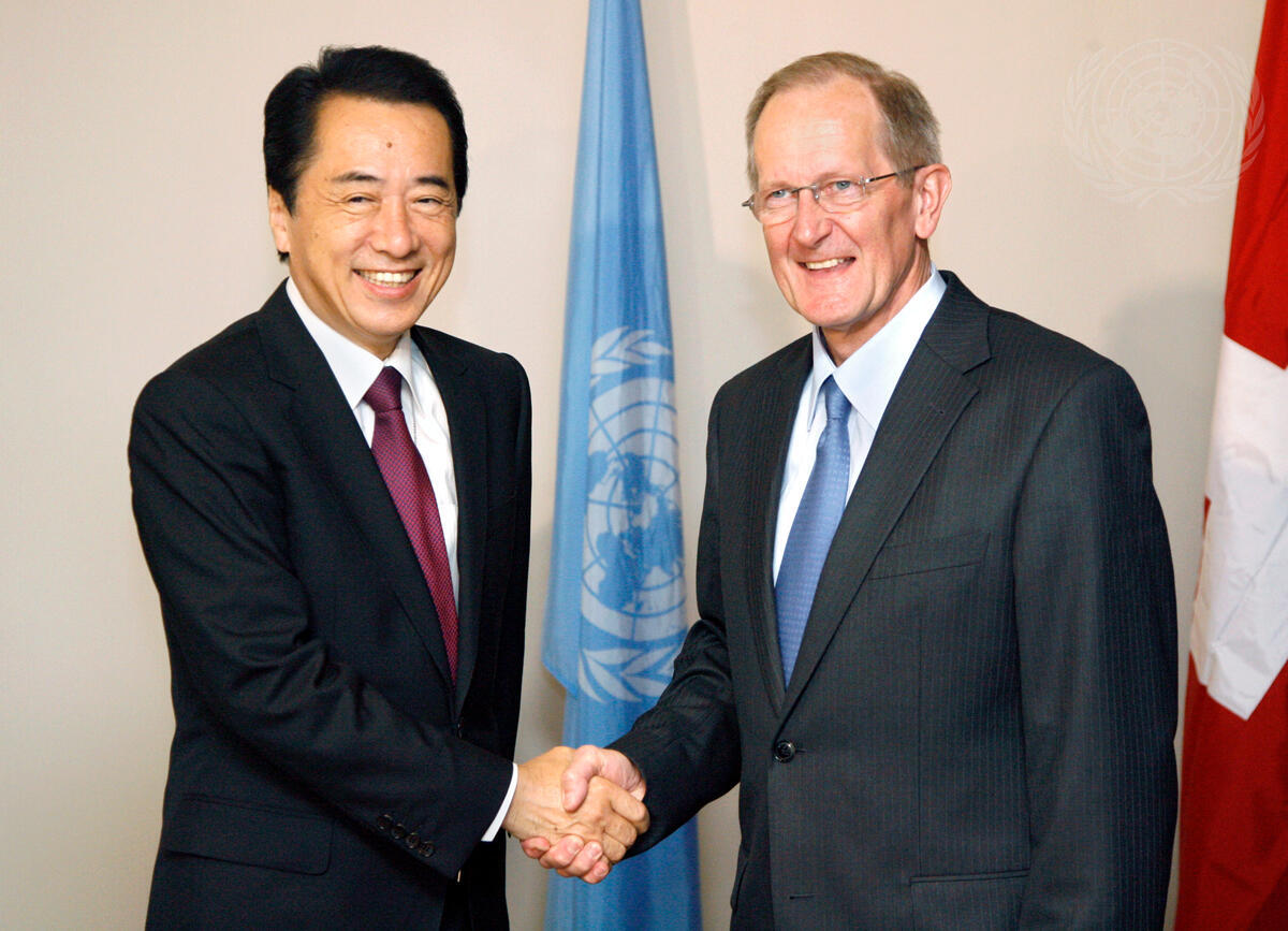 Joseph Deiss (right), President of the sixty-fifth session of the General Assembly, meets with Naoto Kan, Prime Minister of Japan.