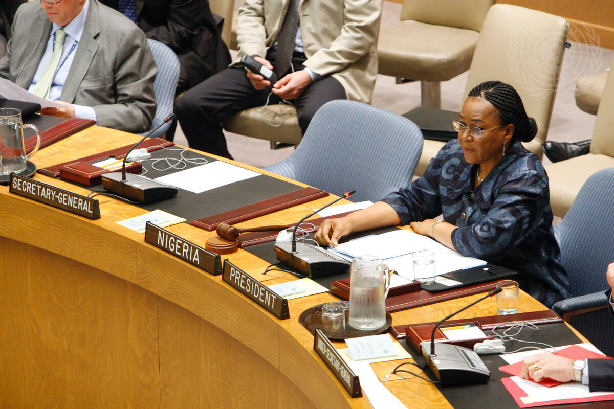 U. Joy Ogwu, Permanent Representative of Nigeria to the UN and President of the Security Council for July, chairs a meeting of the Council on peace and security in the Horn of Africa region. The Council considered the Secretary-General's report on Eritrea and that country's relations with neighbours Dijbouti and Somalia, as well as a report from the United Nations Humanitarian Coordinator for Somalia.