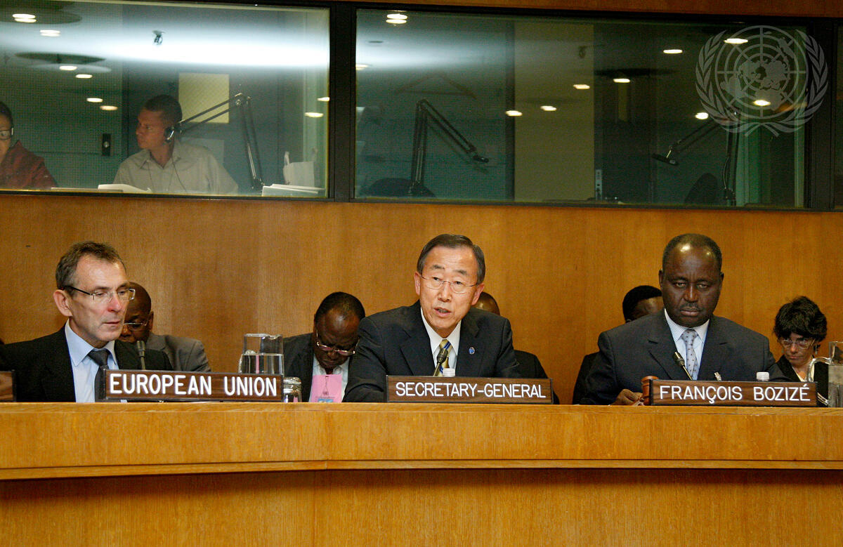 Secretary-General Ban Ki-moon addresses the high-level side event, ""Addressing Peacebuilding and Development Challenges in the Central African Republic"". He is flanked by Andris Piebalgs (left), European Commissioner for Development, and François Bozizé, President of the Central African Republic.