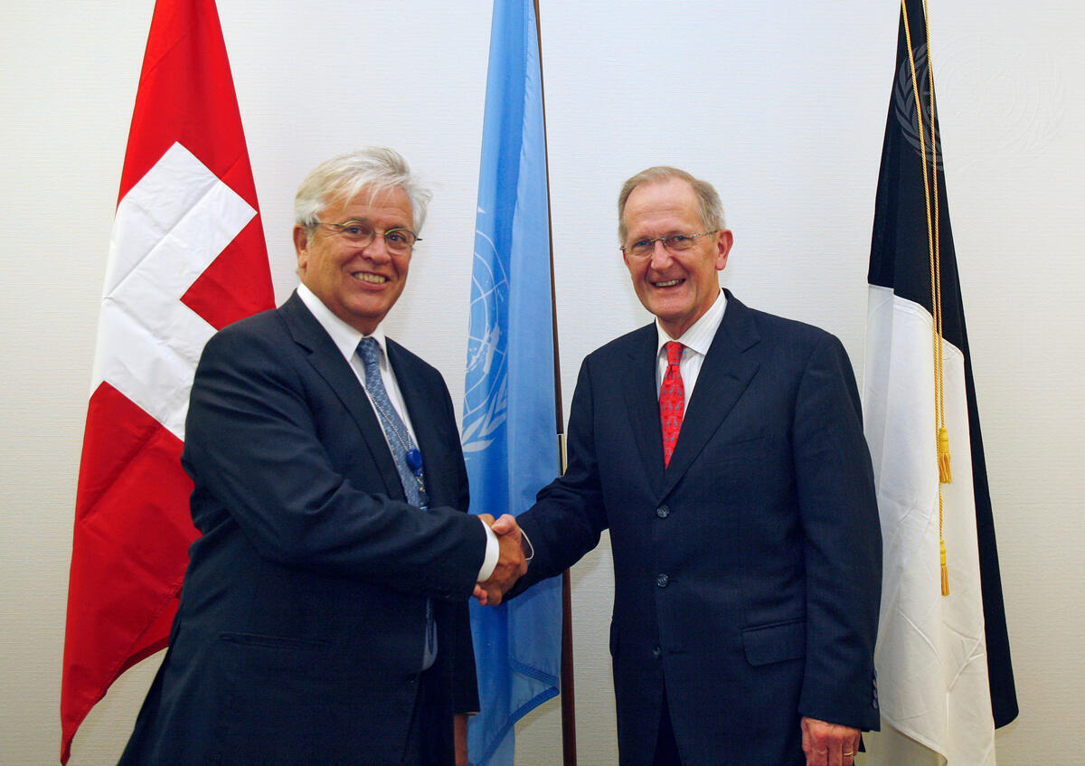 Joseph Deiss (right), President of the sixty-fifth session of the General Assembly, meets with Joan Clos, Executive Director of UN-Habitat.