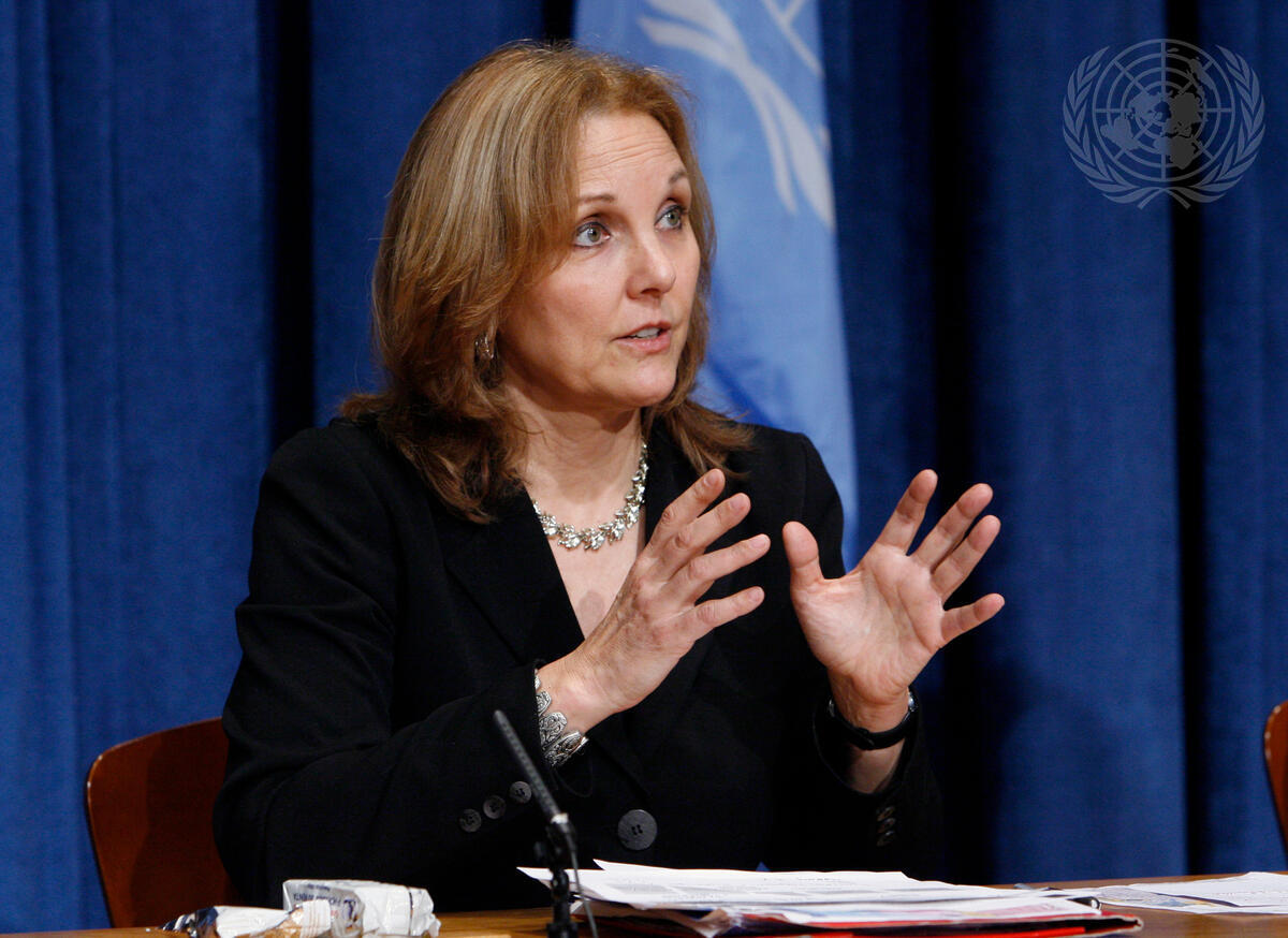 Josette Sheeran, Executive Director of the United Nations World Food Programme (WFP), briefs journalists after her two-day visit to Haiti where her organization is delivering life-saving food supplies. Speaking of the difficult conditions in earthquake-ravaged Haiti, she remarked, ""this is one of the most complex -- if not the most complex"" situation WFP has ever faced.