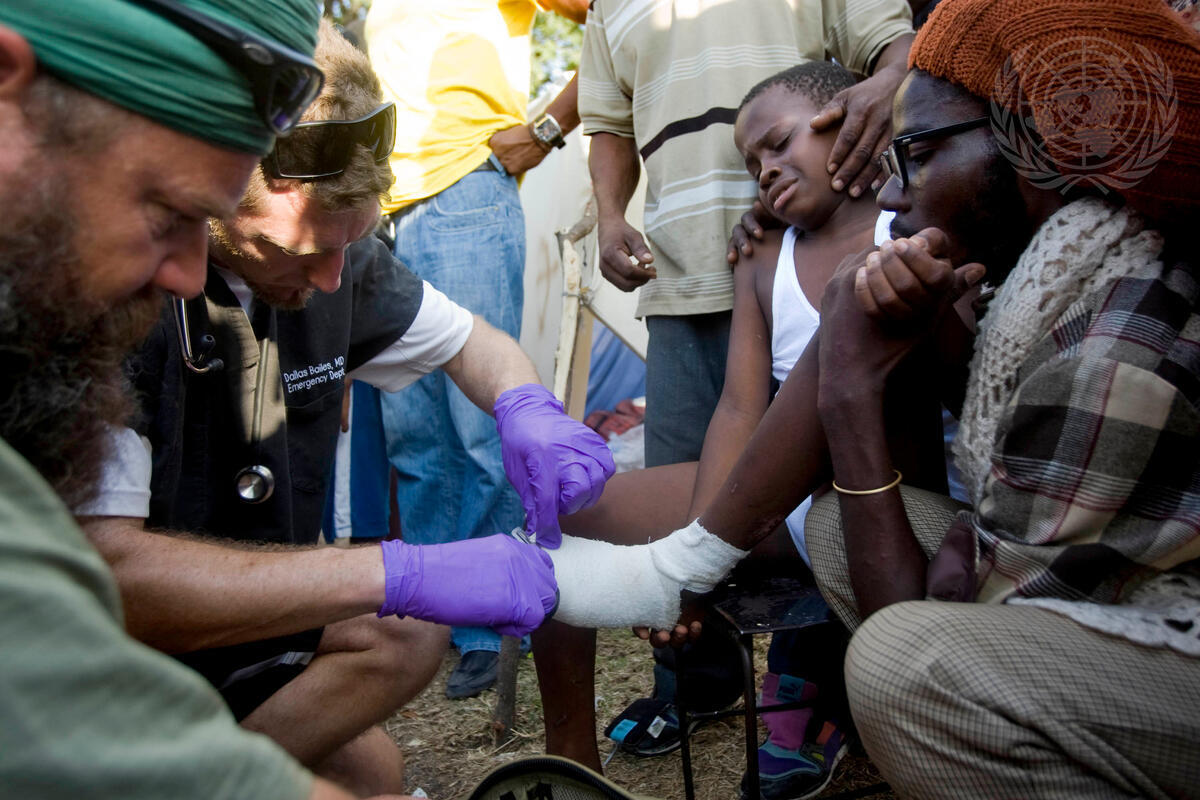 A U.S. doctor treats a boy at a camp on Port-au-Prince's golf course, where many displaced Haitians have set up temporary shelters.