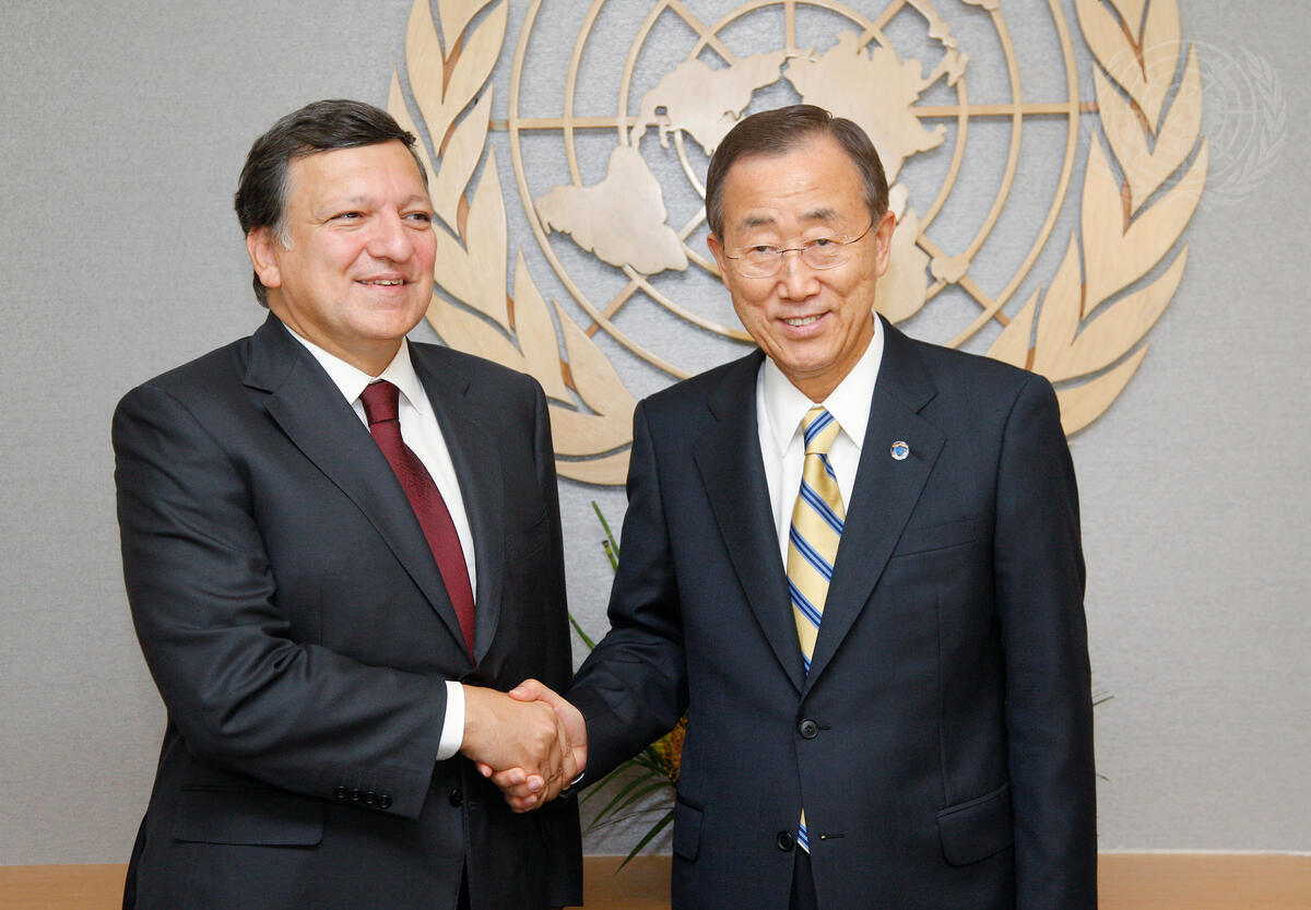 Secretary-General Ban Ki-moon (right) meets with José Manuel Barroso, President of the European Commission.