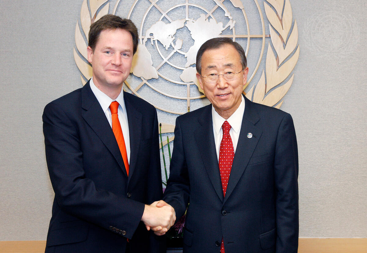 Secretary-General Ban Ki-moon (right) meets with Nick Clegg, Deputy Prime Minister of the United Kingdom.