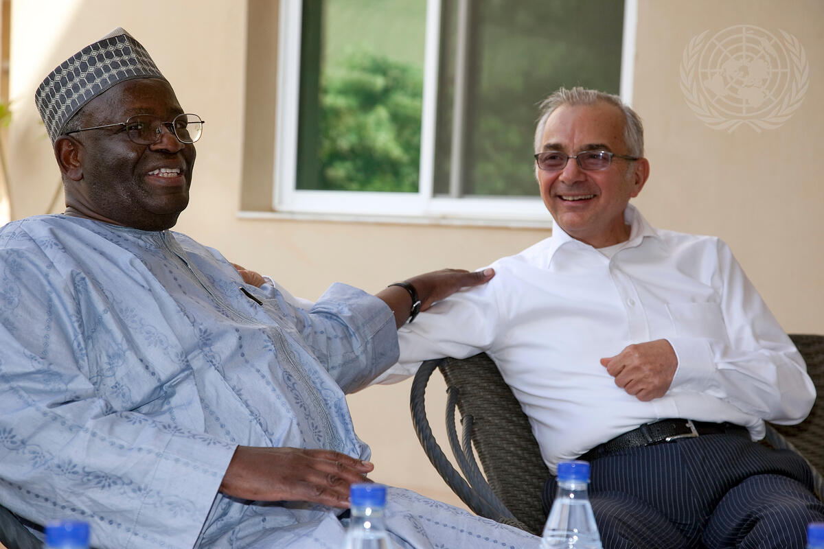 Ibrahim Gambari (left), new Joint Special Representative for the African Union-United Nations Hybrid Operation in Darfur (UNAMID), meets with Ashraf Jehangir Qazi, Special Representative of the Secretary-General for the Sudan, in Sudanese capital Khartoum.