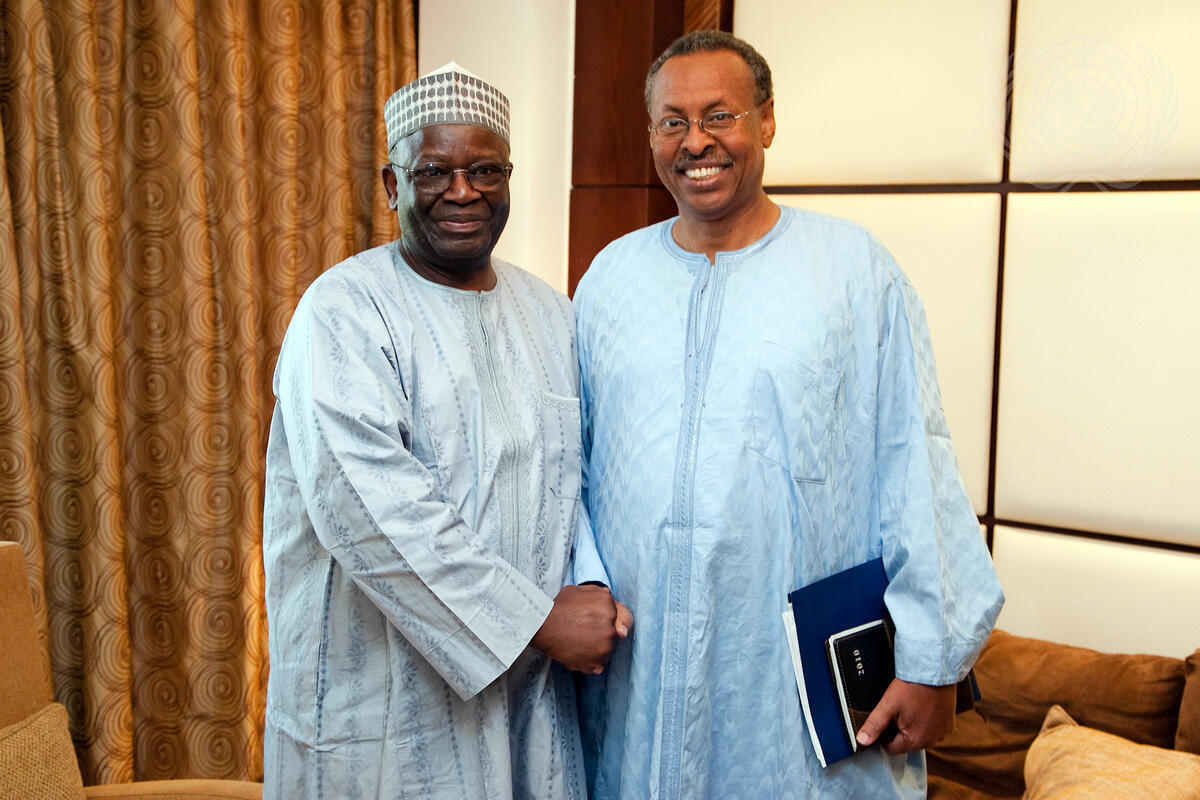 Ibrahim Gambari (left), new Joint Special Representative for the African Union-United Nations Hybrid Operation in Darfur (UNAMID), meets with Mohamed Yonis, Deputy Joint African Union-United Nations Special Representative for Operations and Management, in Khartoum, Sudan.