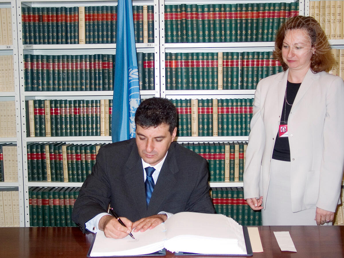 Ambassador Mihnea Loan Motoc, Permanent Representative of Romania, signs the Agreement on Privileges and Immunities of the International Criminal Court.