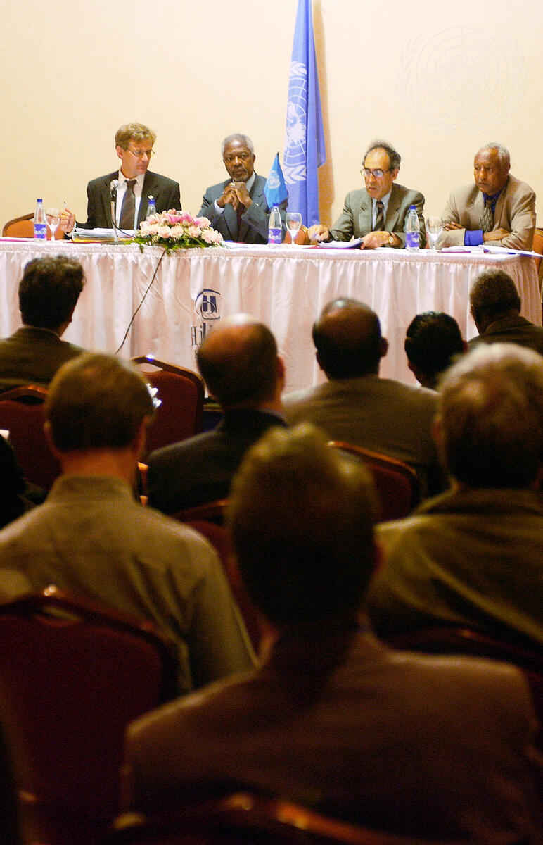 Secretary-General Kofi Annan (second from left) met with his senior officials and representatives of the Non-governmental organizations on arrival at Khartoum, to review the unfolding humanitarian crisis in the Darfur region of Sudan.