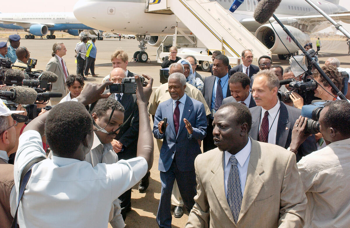 Secretary-General Kofi Annan (centre, with hands raised) arrives in Khartoum airport.