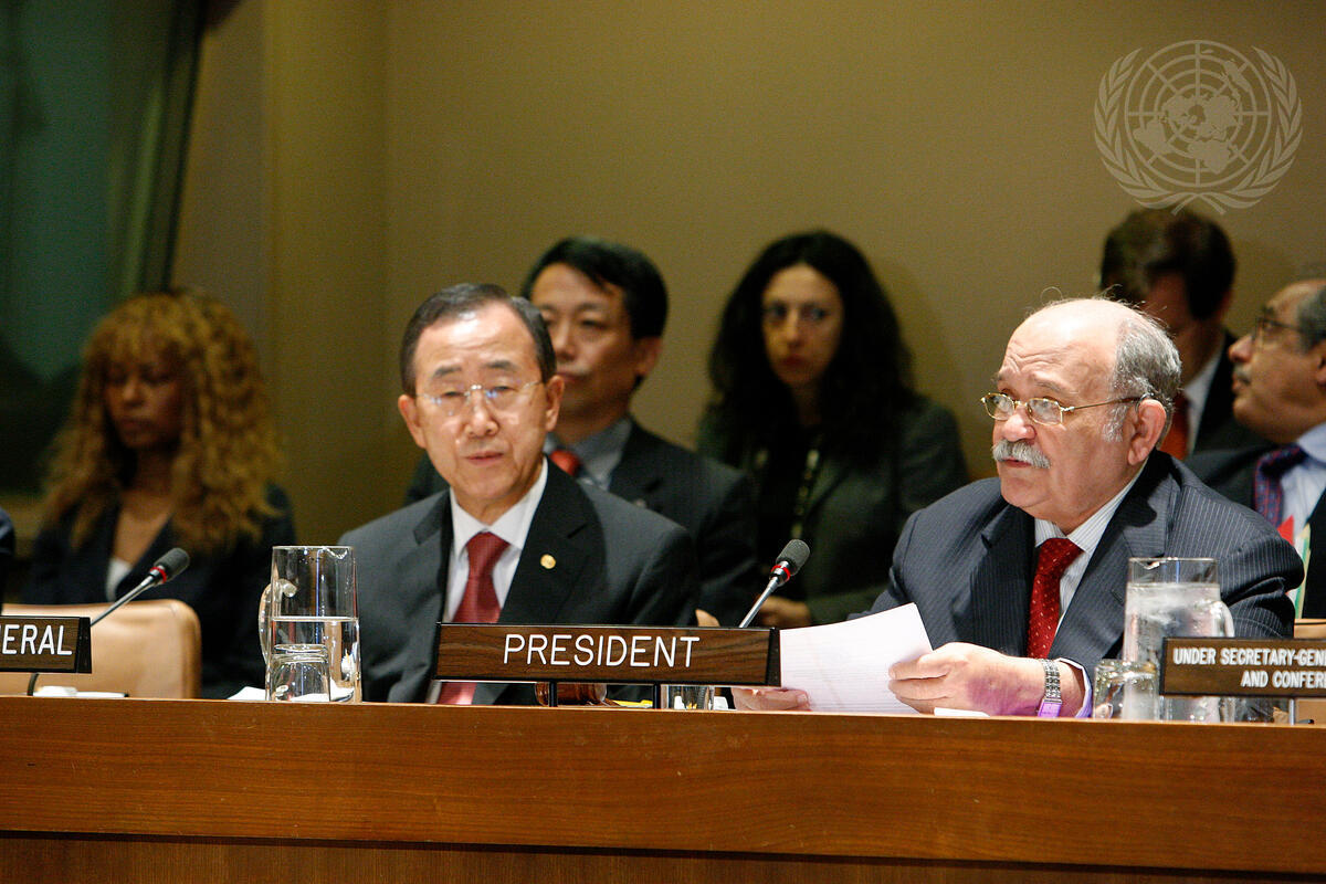 Miguel d'Escoto Brockmann, President of the sixty-third session of the General Assembly, chairs an informal session of the Assembly on the outbreak of the H1N1 Influenza virus, as Secretary-General Ban Ki-moon (second from left), listens.