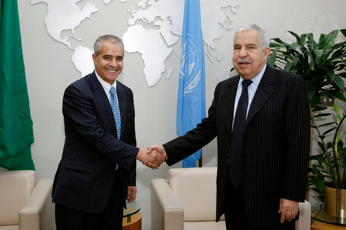 Ali Abdussalam Treki (right), President of the sixty-fourth session of the General Assembly, meets with Ahmed Djoghlaf, Executive Secretary of the Convention on Biological Diversity.