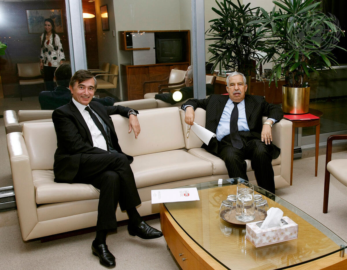Ali Abdussalam Treki (right), President of the sixty-fourth session of the General Assembly, meets with Philippe Douste-Blazy, former Minister for Foreign Affairs of France.