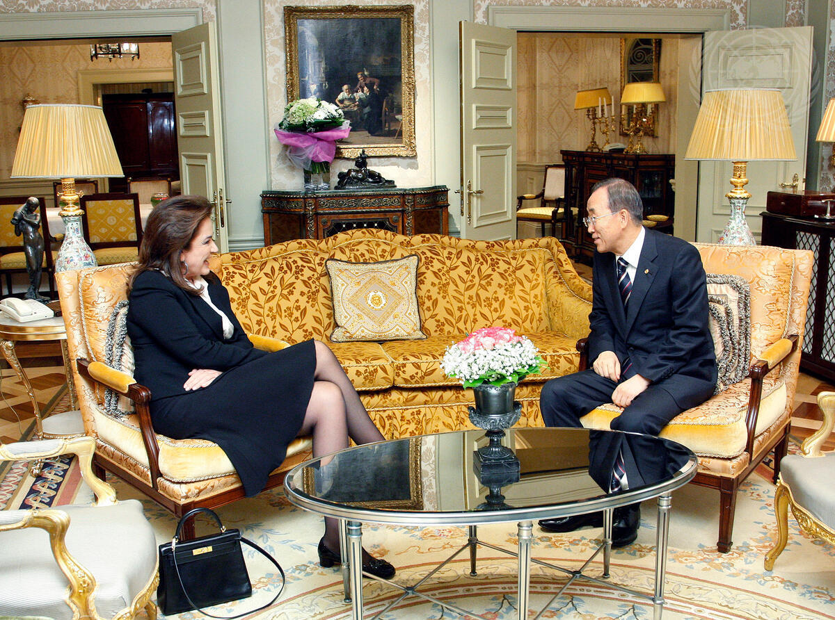 Secretary-General Ban Ki-moon (right) meets with Dora Bakoyannis, former Minister for Foreign Affairs of Greece, in Athens.