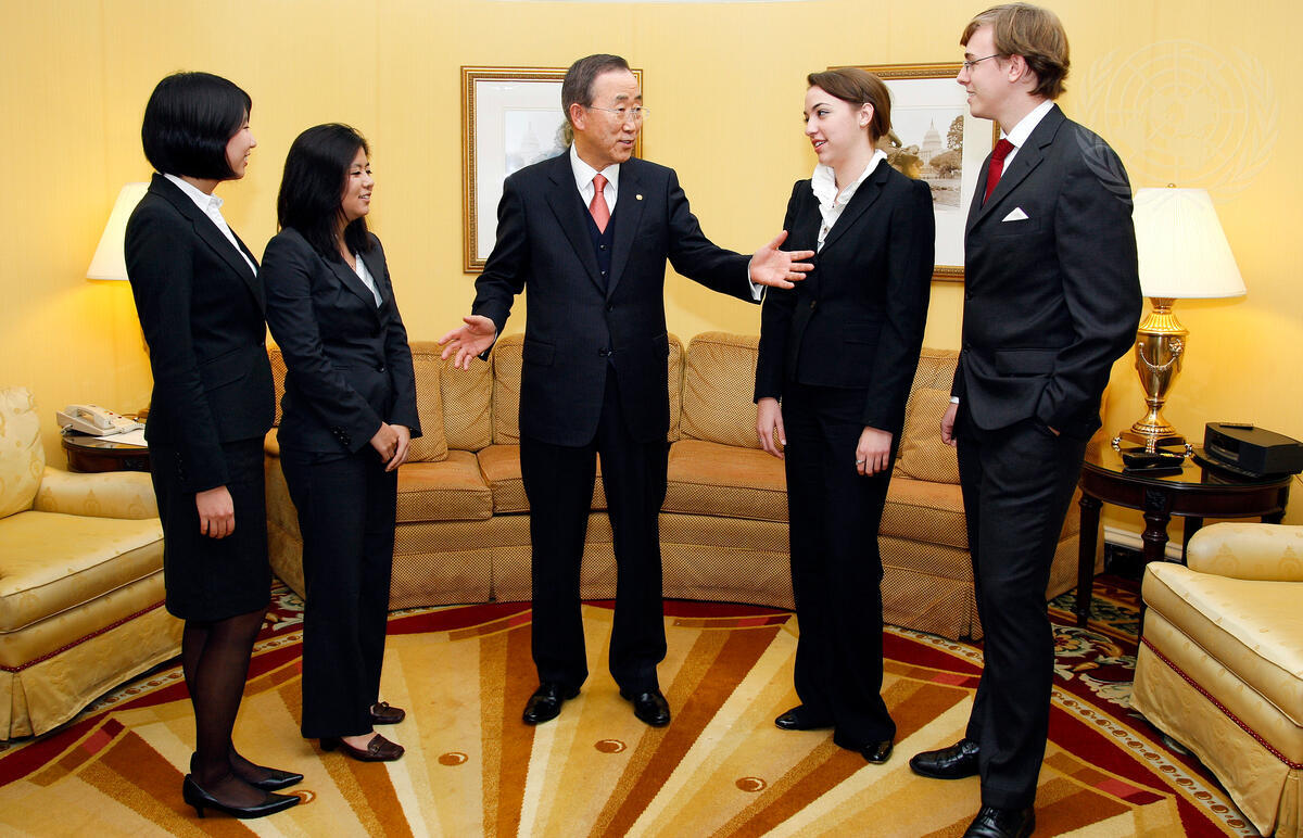 Secretary-General Ban Ki-moon (centre) meets with UN interns based at the United Nations' office in Washington D.C.