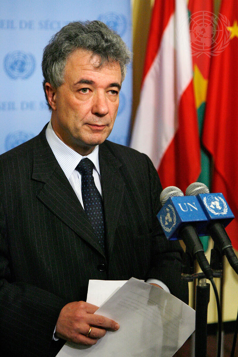 Thomas Mayr-Harting, Permanent Representative of Austria to the United Nations and President of the Security Council for November, briefs reporters following Security Council consultations on Lebanon. On behalf of the Council Mr. Mayr-Harting welcomed the country's formation of a new unity government and expressed continued support for the United Nations Interim Force in Lebanon (UNIFIL).