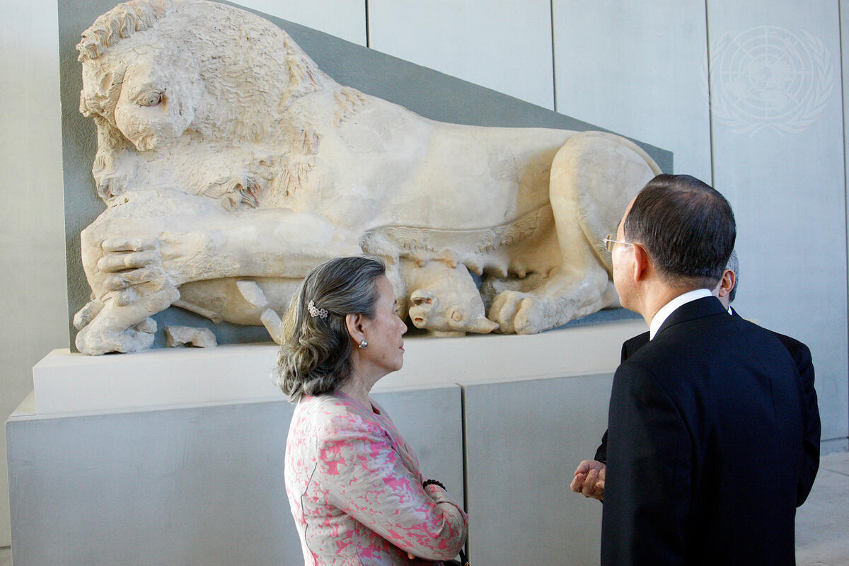 Secretary-General Ban Ki-moon (right) and his wife, Yoo Soon-taek, admire artifacts from the Acropolis at the Acropolis Museum in Athens, Greece.