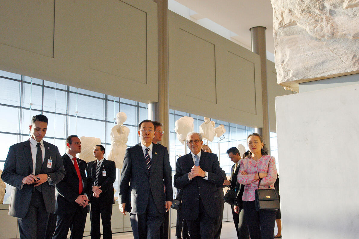 Secretary-General Ban Ki-moon (third from right) and his wife, Yoo Soon-taek (right), admire the Acropolis' artifacts, exhibited at the Acropolis Museum in Athens, Greece. They are guided by Dimitrios Pandermalis (second from right), President of the Museum's Board of Directors.
