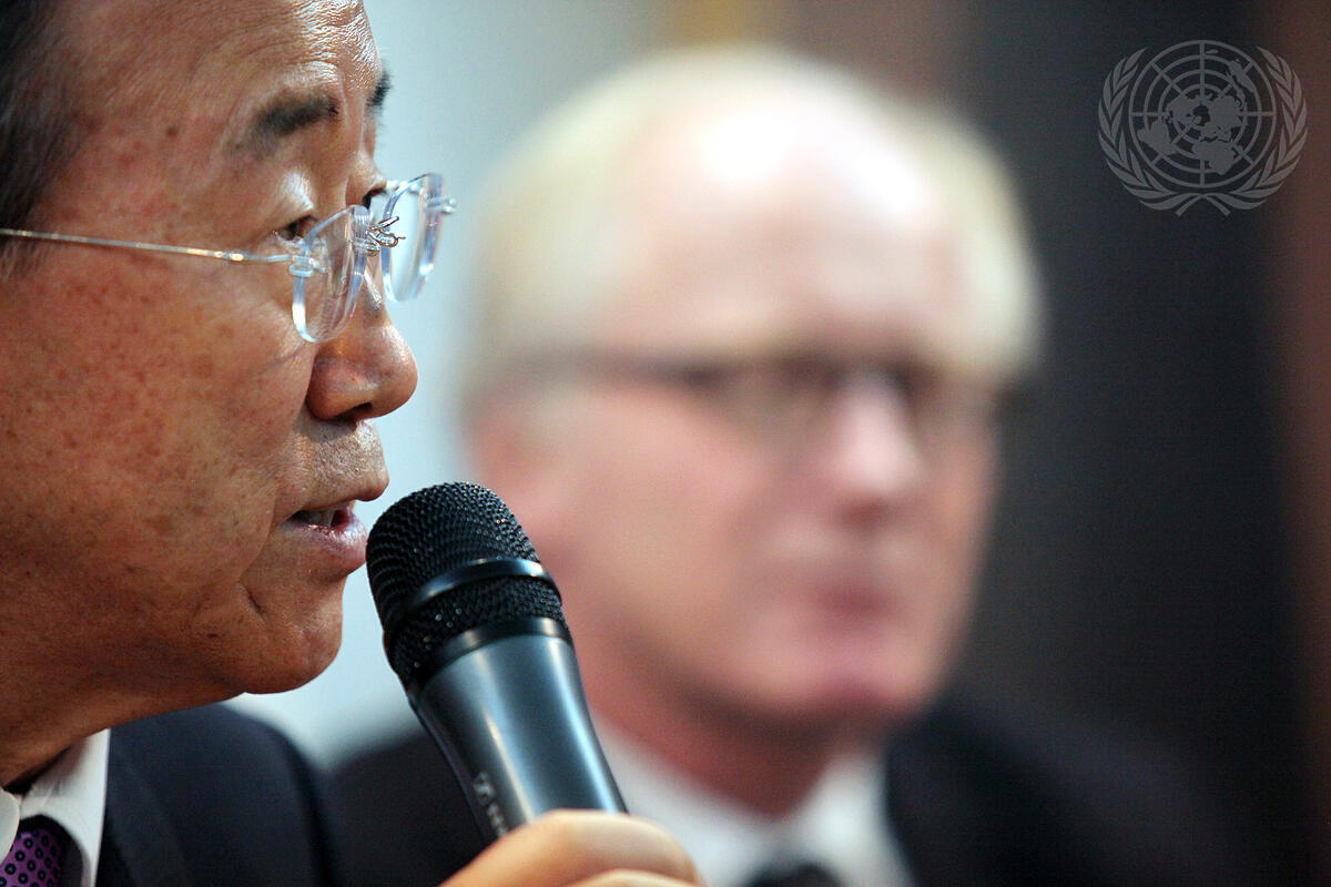 Secretary-General Ban Ki-moon (left) addresses staff members of the United Nations Assistance Mission in Afghanistan (UNAMA) during a one-day visit to express his support for the work of the Mission and to convey his condolences for the loss of five UN staff, killed on 28 October in an attack on a guest house in Kabul. Also shown is Kai Eide, Special Representative of the Secretary-General for Afghanistan and Head of UNAMA.