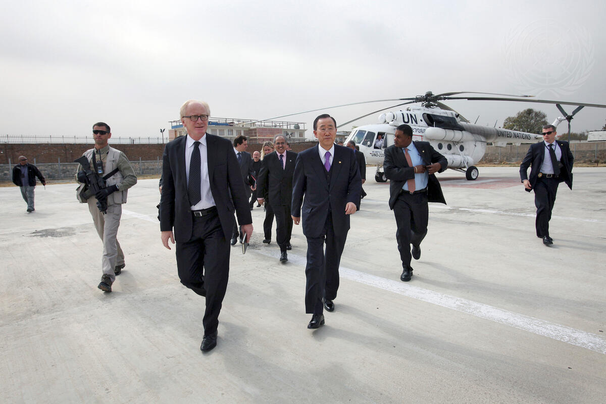 Secretary-General Ban Ki-moon (third from right), accompanied by Kai Eide (second from left), his Special Representative for Afghanistan and Head of the United Nations Assistance Mission in Afghanistan (UNAMA), arrives at the compound for the UN Office for the Co-ordination of Humanitarian and Economic Assistance Programmes in Afghanistan, in Kabul. Mr. Ban is on a one-day visit to the Afghan capital to express his support for UNAMA's work and to convey his condolences for the loss of five UN staff, killed on 28 October in an attack on a guest house in Kabul.