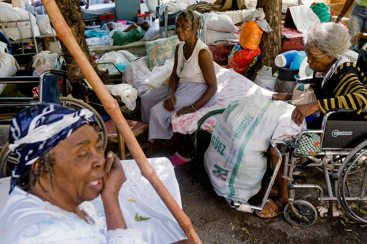 Women in Port-au-Prince rest outside a hospital for the elderly which collapsed in Haiti's earthquake.