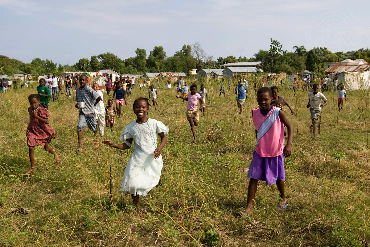 Children in the town of Petit-Goâve, Haiti, some 60 km from capital Port-au-Prince, run towards a UN helicopter.