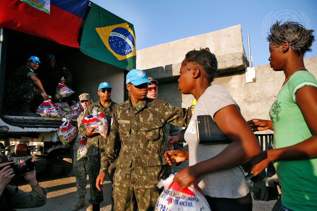 United Nations Stabilization Mission in Haiti (MINUSTAH)'s Brazilian peacekeepers and United States soldiers distribute food and water in the slum of Cité Soleil, Haiti.