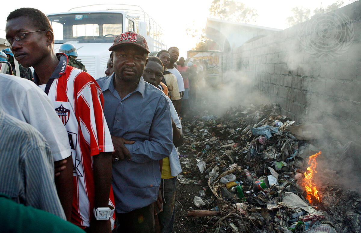 Haitians in the seaside slum of Cité Soleil form a queue for food and water, jointly distributed by troops from the United Nations Stabilization Mission in Haiti (MINUSTAH) and U.S. Army.