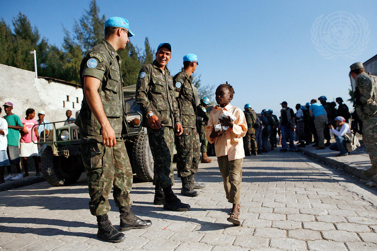 United Nations Stabilization Mission in Haiti (MINUSTAH)'s Brazilian peacekeepers and United States soldiers distribute food and water in the slum of Cité Soleil, Haiti. Children were given special high calorie protein bars.