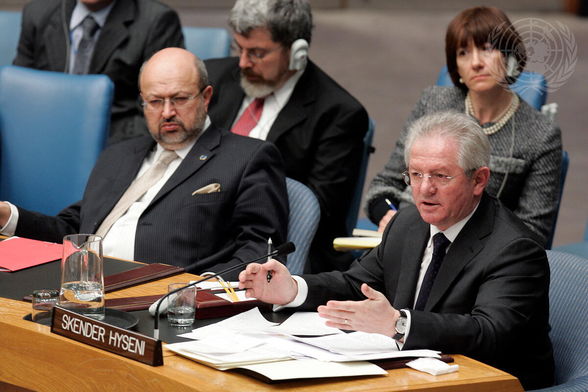 Skënder Hyseni, representative of Kosovo, addresses a Security Council meeting in which the Council considered the Secretary-General's latest three-monthly report on the United Nations Interim Administration Mission in Kosovo (UNMIK).
