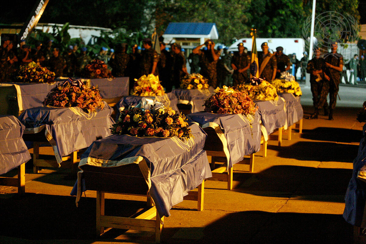 Flower-covered coffins at the memorial service for military personnel of the United Nations Stabilization Mission in Haiti (MINUSTAH) testify to the tragic losses suffered by the Mission after an earthquake struck Port-au-Prince, Haiti.