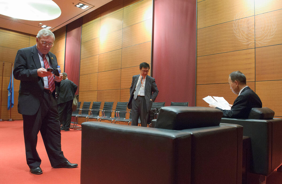 Secretary-General Ban Ki-moon (seated right) is pictured looking over notes moments before the opening of the 3rd Association of Southeast Asian Nations (ASEAN)-UN Summit inside the National Convention Center in Hanoi, Viet Nam. With Mr. Ban is B. Lynn Pascoe (left), Under-Secretary-General for Political Affairs.