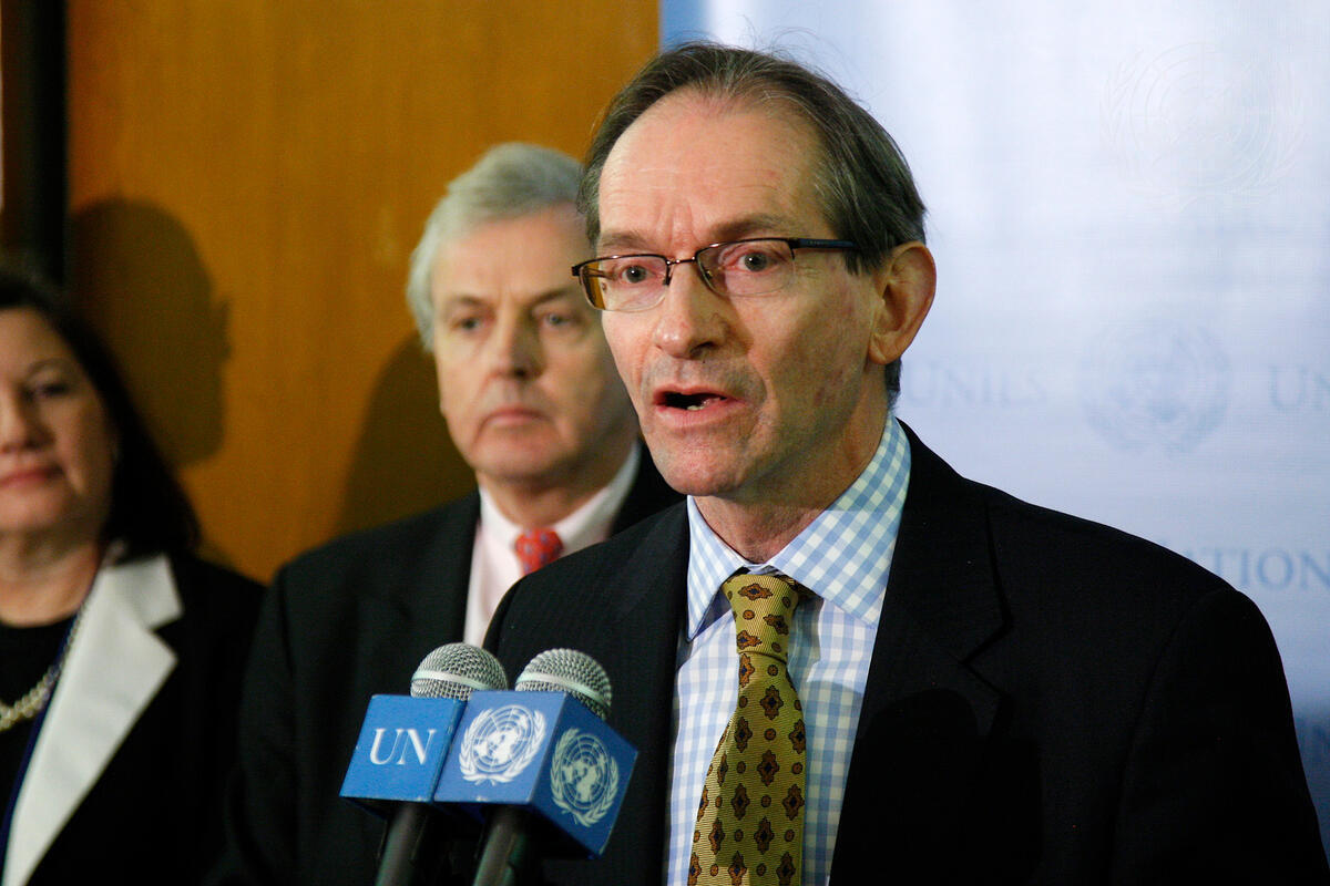 John McNee, Permanent Representative of Canada to the United Nations, briefs reporters on his country's relief efforts in Haiti. Mr. McNee added that his government was planning an international conference in Montréal to take stock of the situation in Haiti and help launch the country's reconstruction.