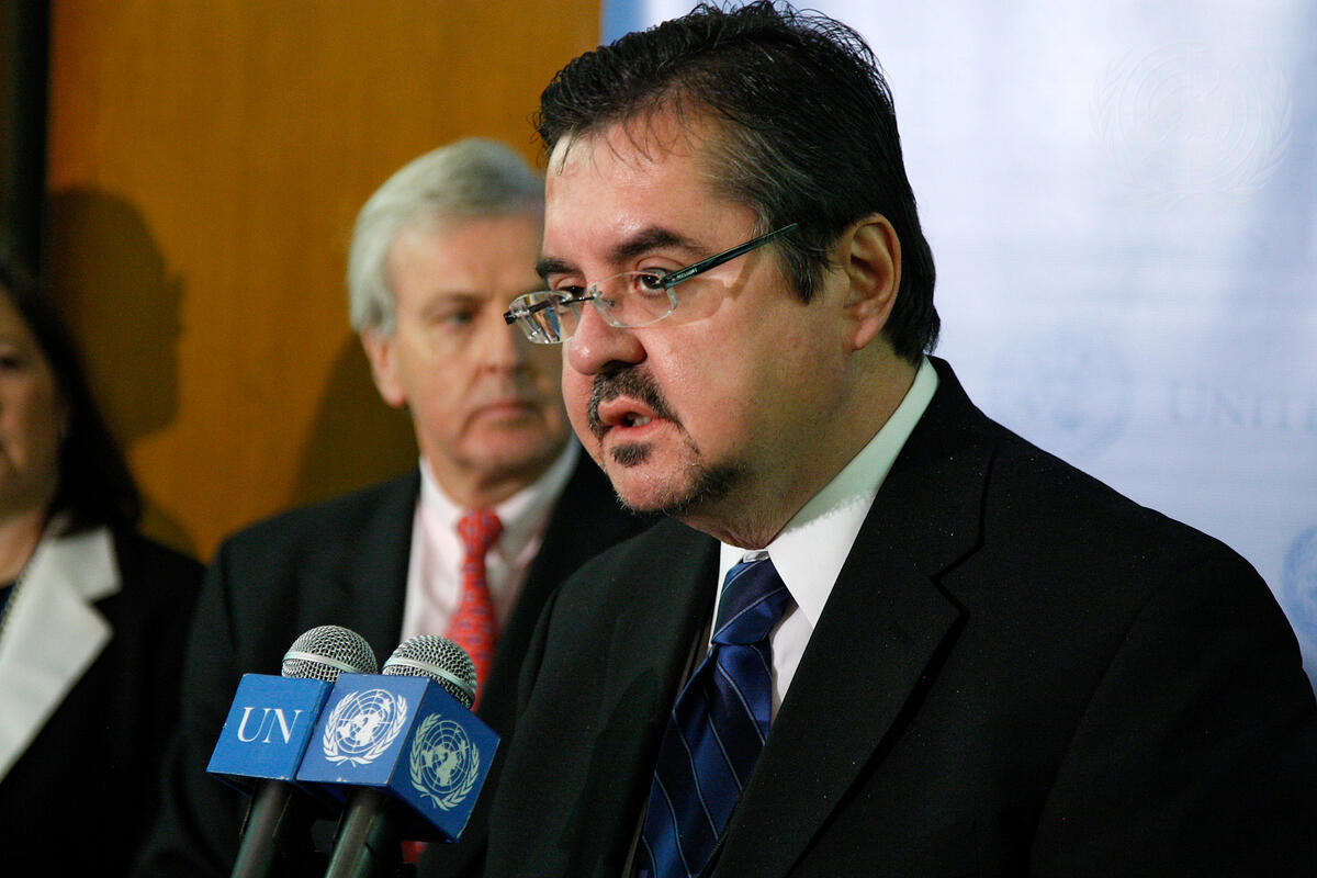 Gustavo Álvarez, Deputy Permanent Representative of Uruguay to the United Nations, briefs reporters on his country's relief efforts in Haiti.