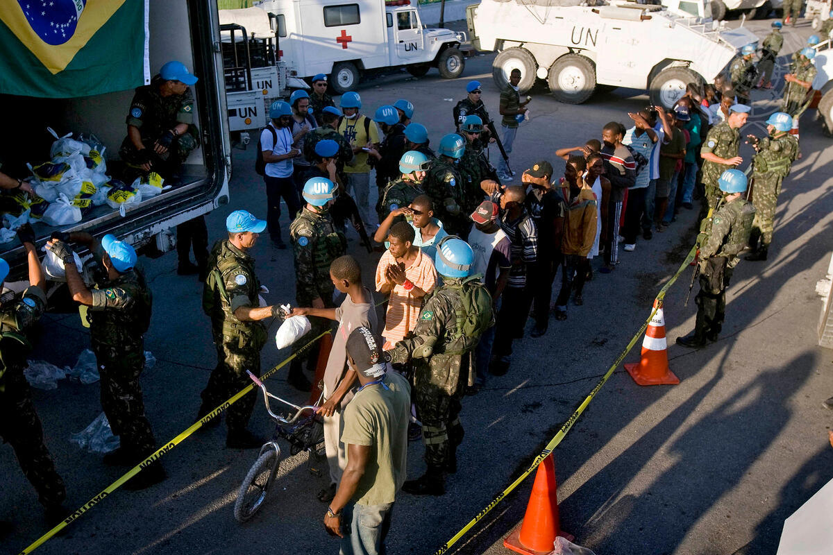 Brazilian peacekeepers from the United Nations Stabilization Mission in Haiti (MINUSTAH) distribute water and food in Port-au-Prince, Haiti.