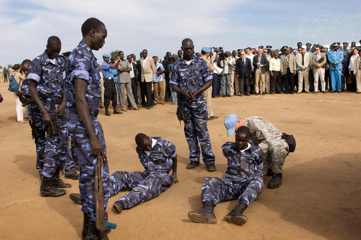 Recruits for the Southern Sudan Police Service (SSPS), along with UN Police officers, demonstrate techniques for a visiting delegation of Security Council Members at the John Gurang Unified Memorial Police Training Academy in Rajaf, South Sudan. The recruits will provide security for the region’s upcoming referenda, scheduled for 9 January 2011.