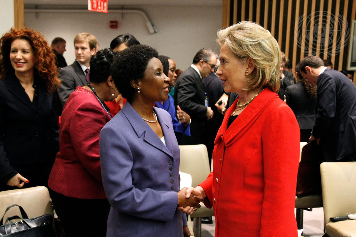 Deputy Secretary-General Asha-Rose Migiro (left) greets Hillary Rodham Clinton, Secretary of State of the United States of America, prior to a meeting of the Security Council marking the 10th anniversary of landmark resolution 1325 on women in peace and security.