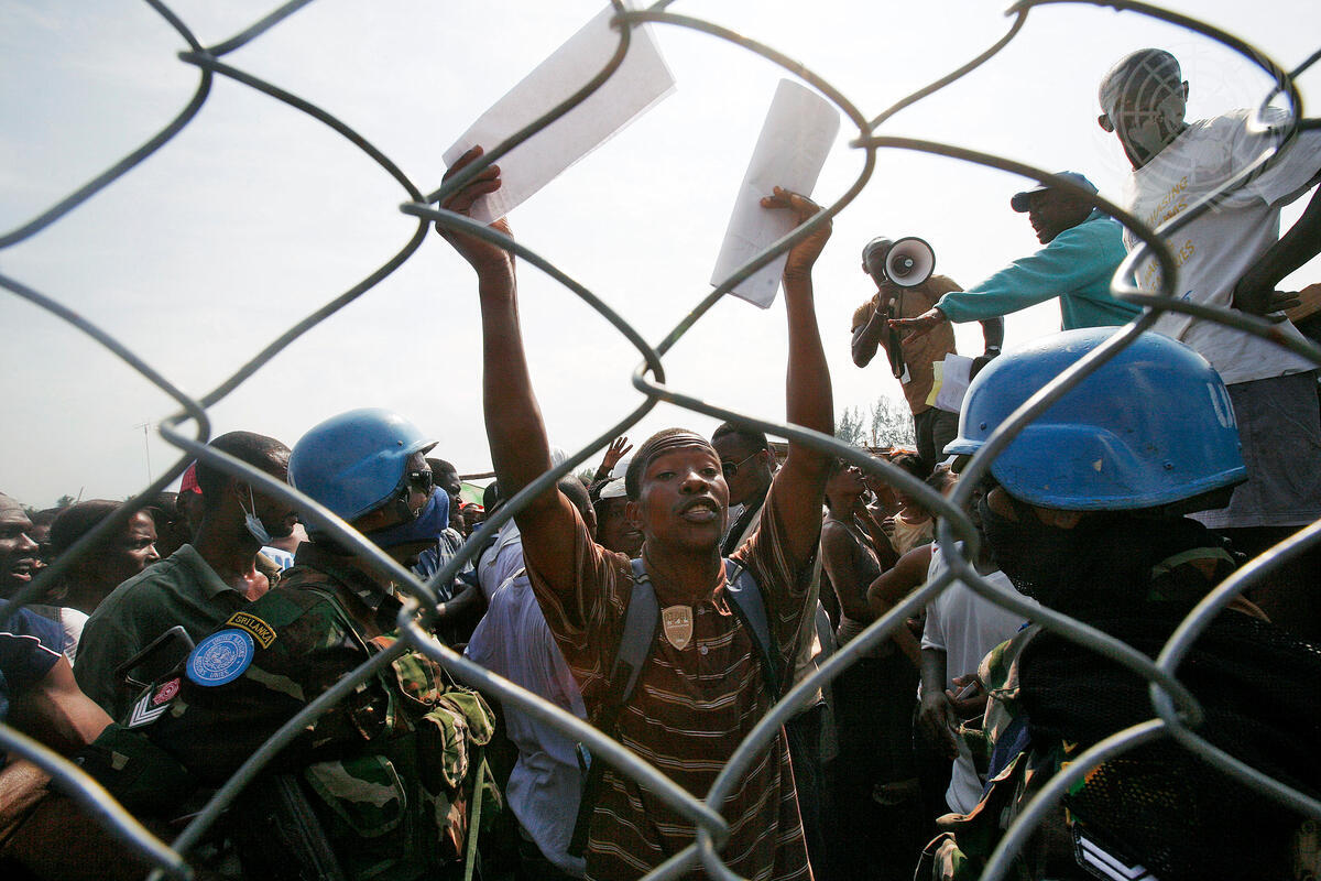 The Sri Lankan Battalion of the United Nations Stabilization Mission in Haiti (MINUSTAH) provides security at a crowded stadium in Léogâne where the UN World Food Programme and the Agency for Technical Cooperation and Development (ACTED) distribute food to Haitians. The coastal city of Léogâne is considered to be at the epicentre of Haiti's disastrous earthquake.