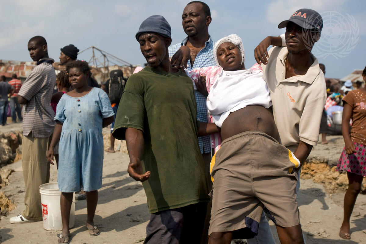 At the port of Haiti's earthquake-stricken capital, Port-au-Prince, a group of men carries a pregnant woman towards a boat.