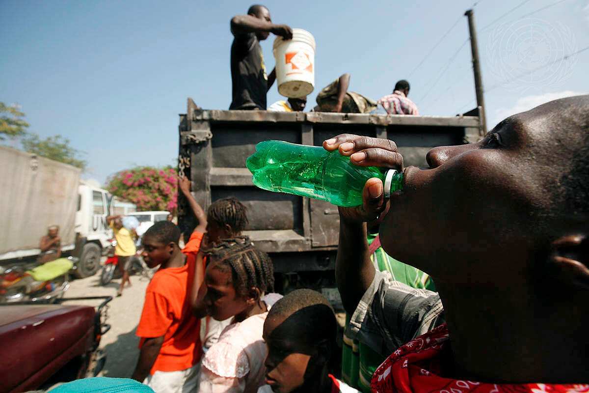 Outside Léogâne's stadium, now a camp where city residents have established temporary shelters, young Haitians in a truck pass out water to anyone with a container. The coastal city of Léogâne is considered to be at the epicentre of the earthquake that devastated Haiti and left its population with few resources.