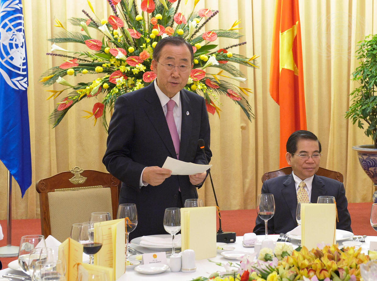 Secretary-General Ban Ki-moon delivers a toast at a gala dinner held in his honour by the President of Viet Nam, Nguyen Minh Triet (seated right), in Hanoi, Viet Nam.