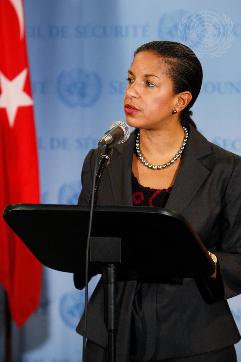 Susan E. Rice, Permanent Representative of the United States of America to the UN, delivers a press statement on behalf of the U.S. Government following a Security Council briefing by the UN's Special Envoy for the implementation of Council resolution 1559 on Lebanon, Terje Roed-Larsen. In the statement Ms. Rice voiced her Government’s deep concerns about ""Hezbollah’s destructive and destabilizing influence"" in the Middle East and the attempts by “other foreign players” to undermine Lebanon’s independence and stability.