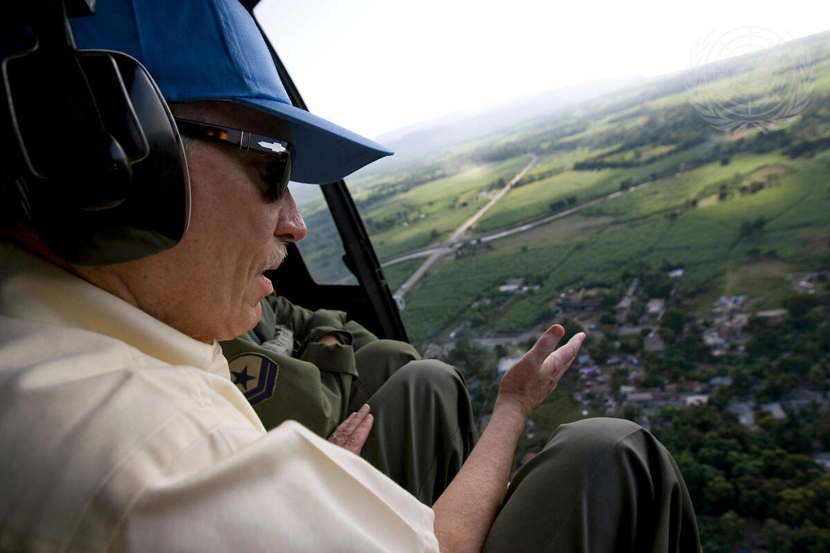 Edmond Mulet, Acting Special Representative of the Secretary-General for Haiti and Head of the United Nations Stabilization Mission in Haiti (MINUSTAH), is pictured aboard a helicopter, surveying the damage done to the town of Gressier, some 20 km outside Port-au-Prince. The United Nations Office for the Coordination of Humanitarian Affairs (OCHA) estimates that 40-50% of Gressier has been destroyed by Haiti's earthquake.