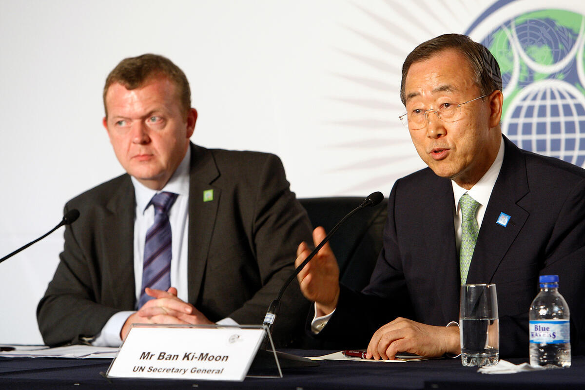 Secretary-General Ban Ki-moon (right) and Lars Løkke Rasmussen, Prime Minister of Denmark, hold a joint press conference at the Commonwealth Heads of Government Meeting (CHOGM) in Port of Spain, Trinidad and Tobago. Mr. Ban and Mr. Rasmussen attended the biennial Commonwealth meeting to urge world leaders' support for a legally binding climate change treaty, on the agenda at the imminent December 2009 UN Climate Change Conference in Copenhagen.