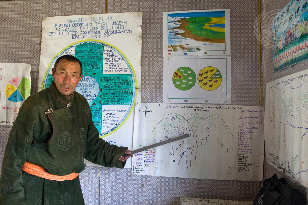 The United Nations Development Programme (UNDP) supports community centres for Mongolian herder groups. Many herdsmen, like the one pictured here, now develop their own land-use plans, conservation maps and sustainable practices for water, forest and pasture management.